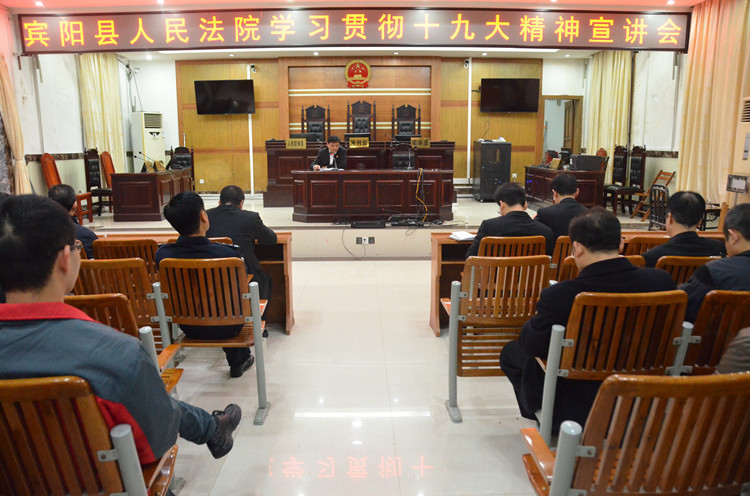 为持续推动干警学习贯彻和牢牢把握十九大精神。12月27日上午,宾阳县法院召开学习贯彻党的十九大精神宣讲会。该院党组书记、院长覃军作专题宣讲,全体干警与会聆听。 在宣讲中,覃军带头重温了十九大报告的精髓,原原本本、原汁原味地再次为全体干警全面阐述了十九大报告的重大思想观点、重大理论创新、重大战略部署和重大意义,激励全体干警不断深入学习贯彻党的十九大精神,